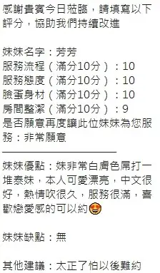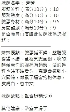可配合 :奶砲,按摩,69,共浴,LG(舌吻)依氣氛衛生而定,可親嘴,無套吹,口爆,品鮑,舔蛋,奶推,屁推,水床浴,變裝(自備免付),絲襪(自備免付),中文溝通,快餐,2S