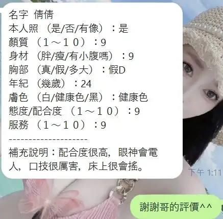 | 服務內容 | 2S ,69 ,共浴 ,可親嘴 ,品鮑 ,奶推 ,奶砲 ,快餐 ,情趣用品(客自備) ,按摩 ,無套吹 ,玩具(按摩棒) ,玩具(跳蛋) ,絲襪 ,自慰秀 ,舔蛋 |