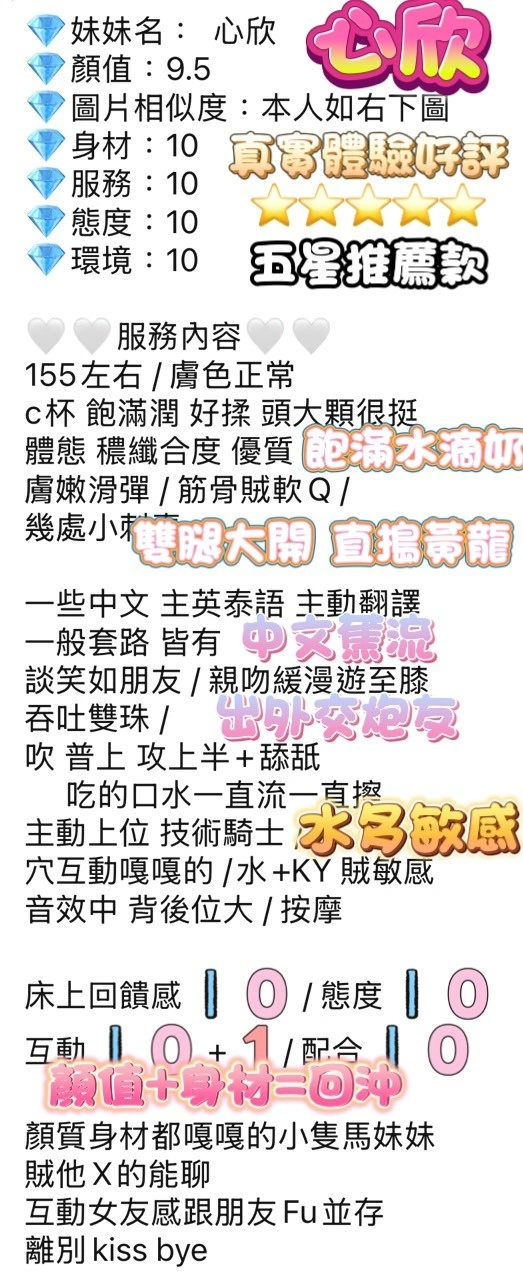 可配合 :奶砲,按摩,69,殘廢澡,LG(舌吻)依氣氛衛生而定,可親嘴,無套吹,口爆,品鮑,舔蛋,奶推,顏射,深喉嚨,快餐,2S