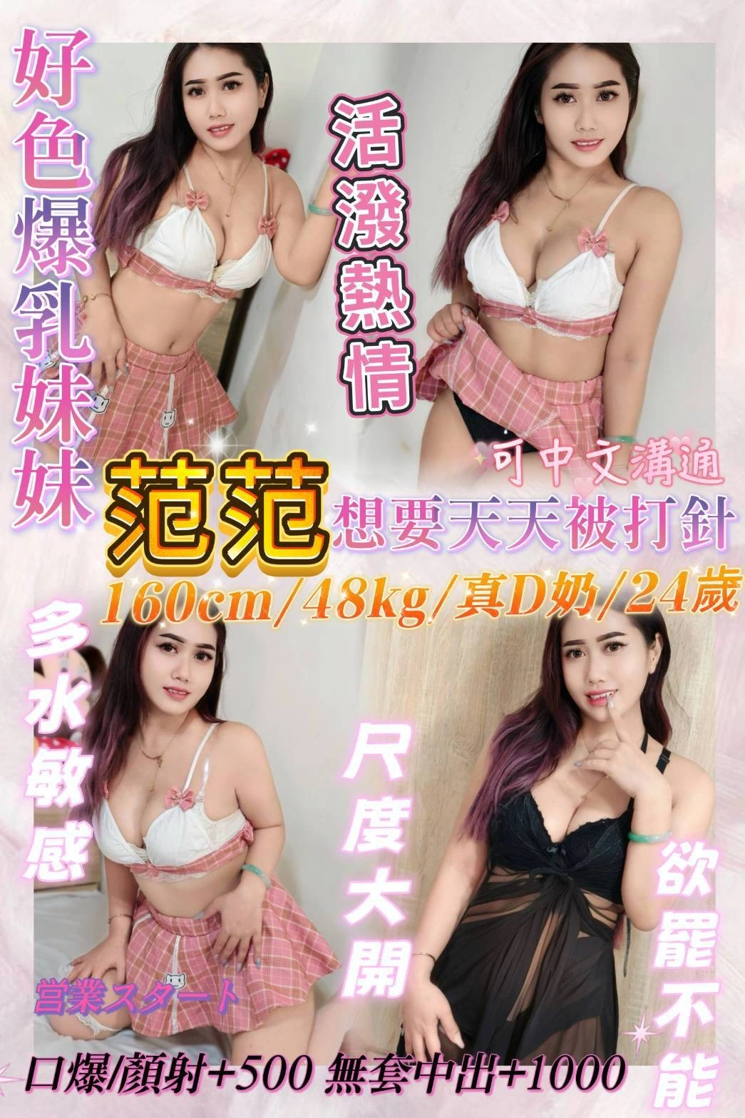 加價項目 : 2S+500(60分),口爆+500,顏射+500,無套內射+1000,絲襪+200