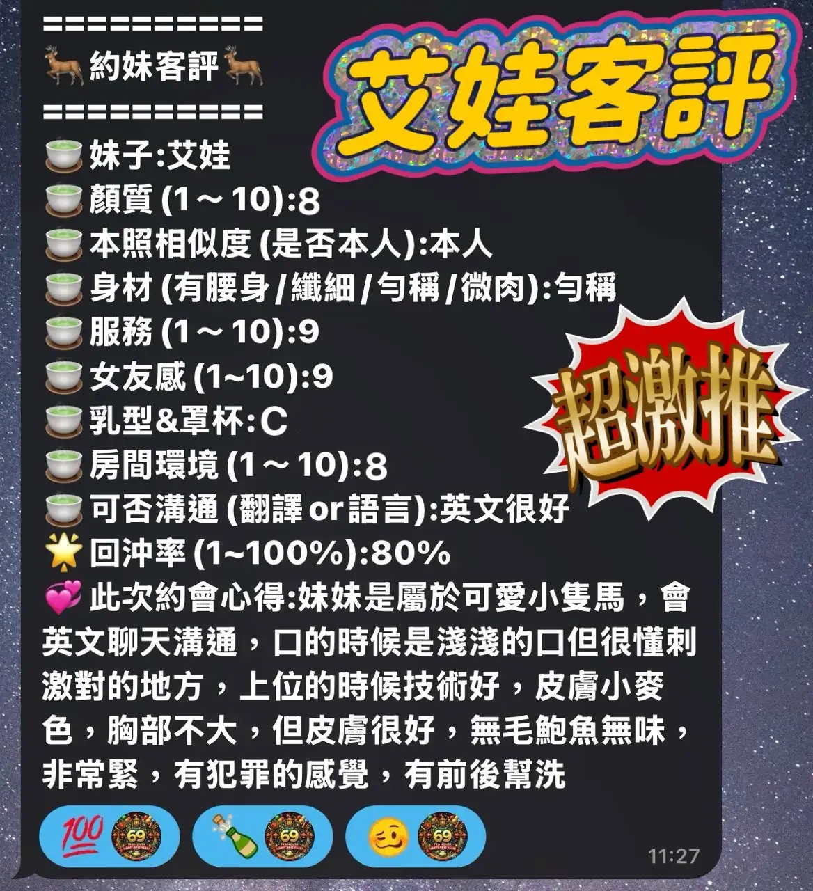 可配合 :奶砲,按摩,69,共浴,殘廢澡,LG(舌吻)依氣氛衛生而定,可親嘴,無套吹,口爆,吞精,品鮑,舔蛋,輕功,顏射,攝影,中文溝通,快餐,2S,包夜