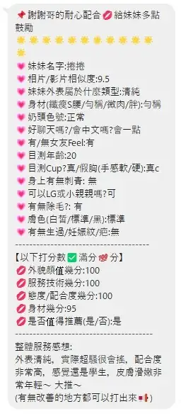 可配合 :奶砲,按摩,共浴,LG(舌吻)依氣氛衛生而定,可親嘴,無套吹,口爆,吞精,舔蛋,冰火,浴中蕭,絲襪,玩具(按摩棒),玩具(跳蛋),攝影,快餐,2S