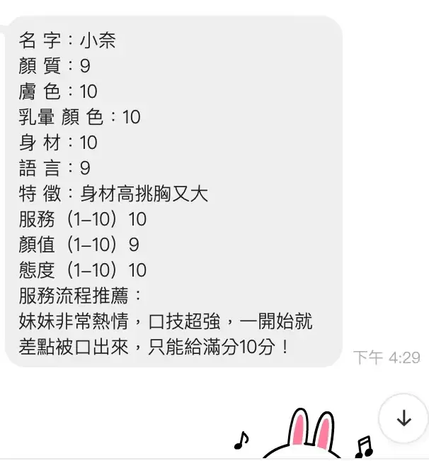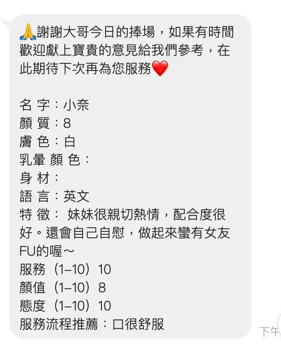 可配合 :奶砲,按摩,69,殘廢澡,LG(舌吻)依氣氛衛生而定,可親嘴,無套吹,口爆,品鮑,舔蛋,奶推,屁推,冰火,浴中蕭,變裝(自備免付),絲襪(自備免付),自慰秀,中文溝通,快餐,2S