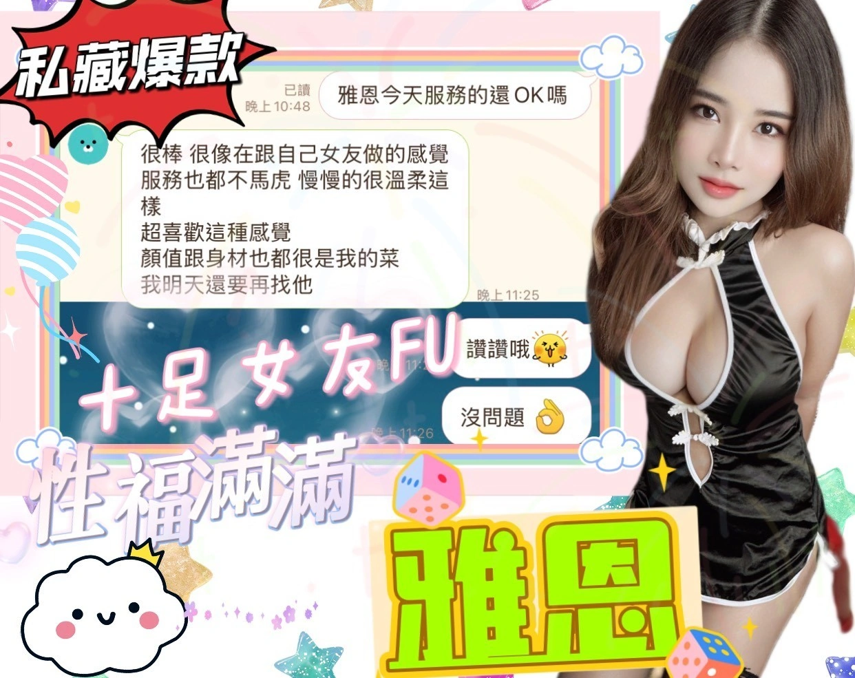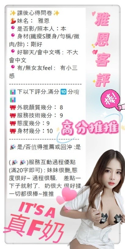 可配合 :奶砲,按摩,69,共浴,泰國浴,LG(舌吻)依氣氛衛生而定,可親嘴,無套吹,品鮑,舔蛋,奶推,屁推,冰火,顏射,絲襪(自備免付),快餐,2S