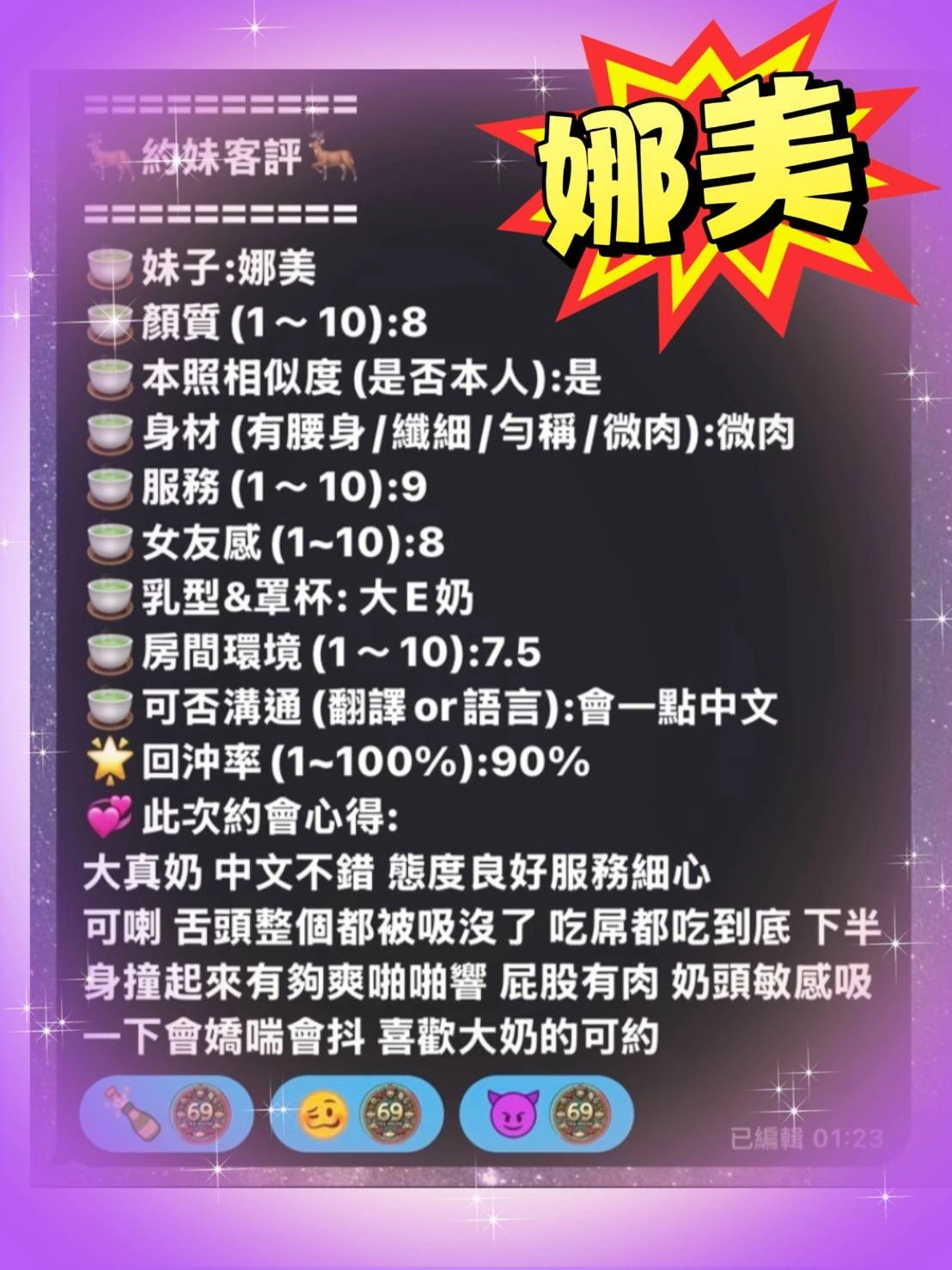 可配合 :奶砲,按摩,69,共浴,殘廢澡,LG(舌吻)依氣氛衛生而定,可親嘴,無套吹,口爆,吞精,品鮑,舔蛋,輕功,無套做,無套內射,中文溝通,快餐,2S