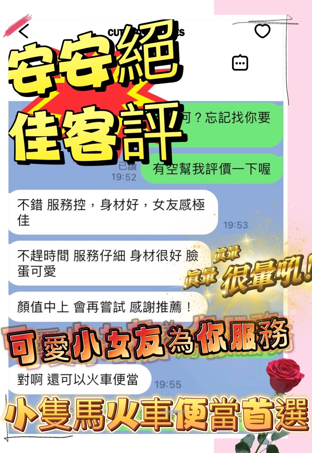 可配合 :奶砲,按摩,69,共浴,可親嘴,無套吹,口爆,舔蛋,奶推,屁推,浴中蕭,絲襪(自備免付),快餐,2S