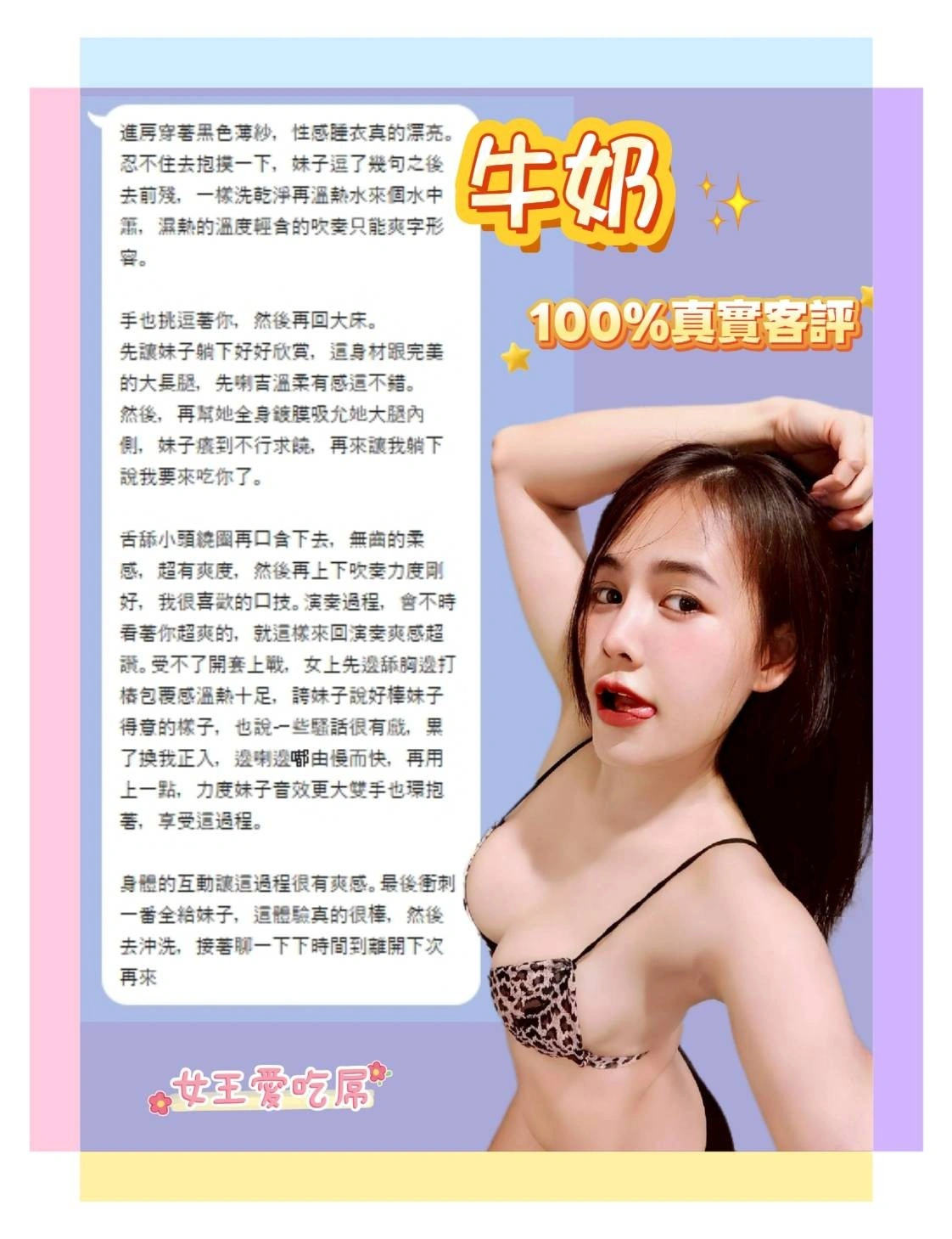 可配合 :奶砲,按摩,69,共浴,LG(舌吻)依氣氛衛生而定,可親嘴,無套吹,口爆,品鮑,舔蛋,奶推,屁推,顏射,絲襪,快餐,2S
