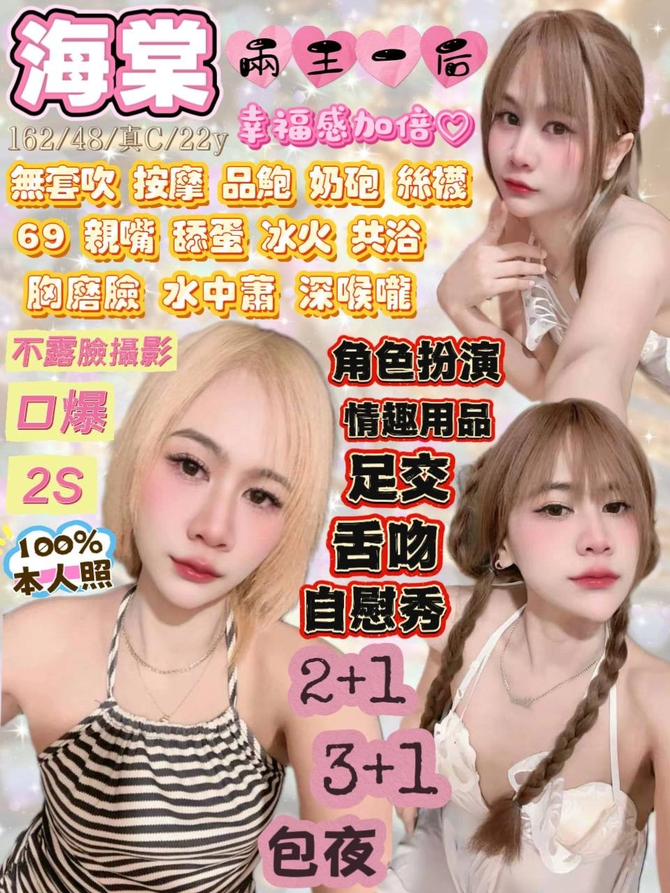 可配合 :奶砲,按摩,69,共浴,LG(舌吻)依氣氛衛生而定,可親嘴,無套吹,口爆,足交,品鮑,舔蛋,冰火,浴中蕭,深喉嚨,跳跳糖吹簫,變裝,絲襪,自慰秀,攝影,快餐,2S,NS,包夜