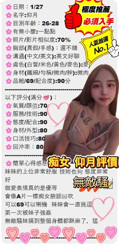 加價項目 : 2S+500,攝影+1000(不拍臉),無套內射+1000,口爆+500,吞精+500,絲襪套裝+200,絲襪+100,0.01套+100