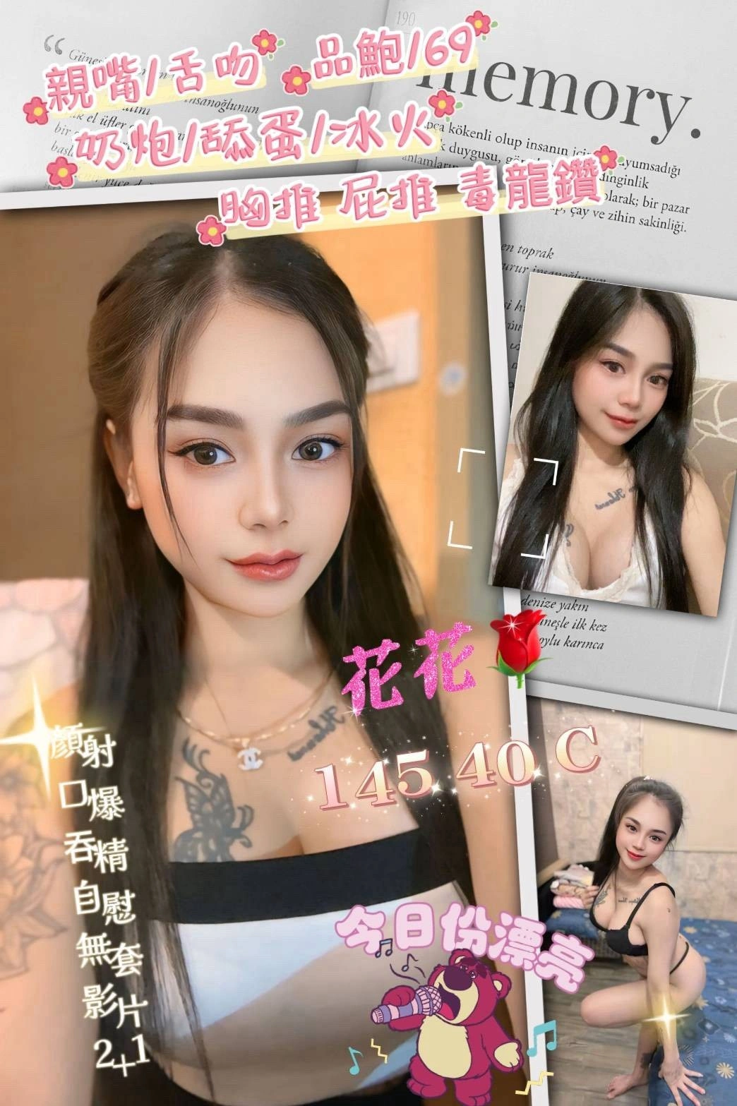 加價項目 : 2S+500,顏射+500,口爆+500,自慰秀+500,吞精 +1000,無套內射+1000,攝影+1000(不露臉),攝影+2000