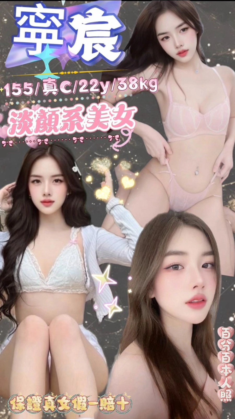 可配合 :按摩,共浴,可親嘴,無套吹,品鮑,浴中蕭,變裝(自備免付),絲襪(自備免付),快餐,2S,包夜