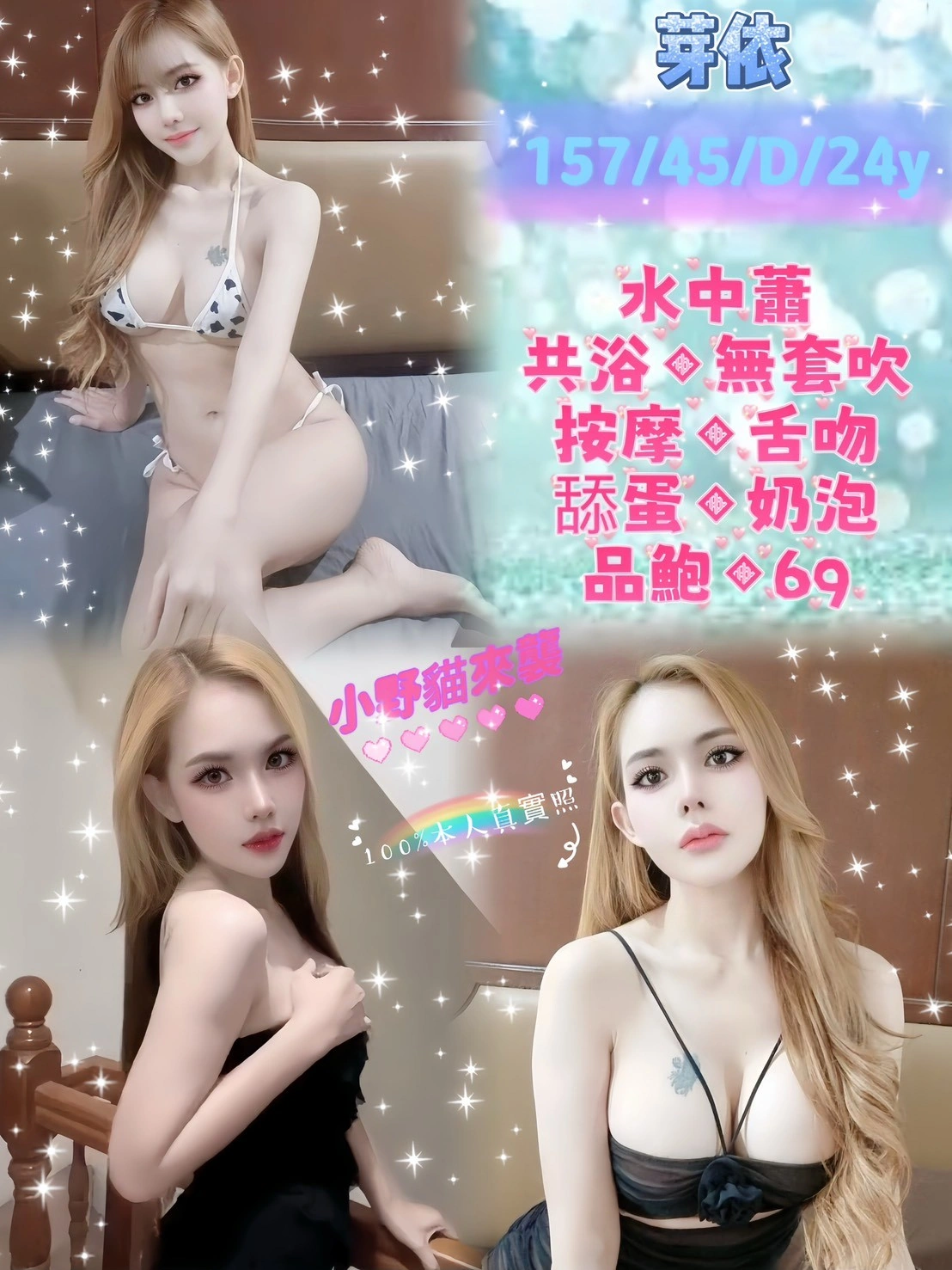 可配合 :奶砲,按摩,69,LG(舌吻)依氣氛衛生而定,可親嘴,無套吹,品鮑,舔蛋,浴中蕭,艷舞秀,自慰秀,快餐,2S