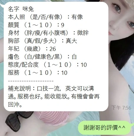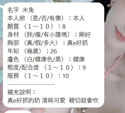 可配合 :奶砲,按摩,69,共浴,可親嘴,無套吹,口爆,品鮑,舔蛋,奶推,絲襪,自慰秀,快餐,2S