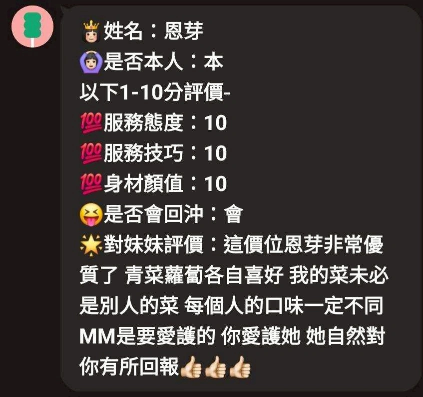 可配合 :奶砲,毒龍,按摩,69,共浴,殘廢澡,泰國浴,LG(舌吻)依氣氛衛生而定,可親嘴,無套吹,口爆,品鮑,舔蛋,奶推,屁推,絲襪(自備免付),無套做,無套內射,快餐,2S,NS