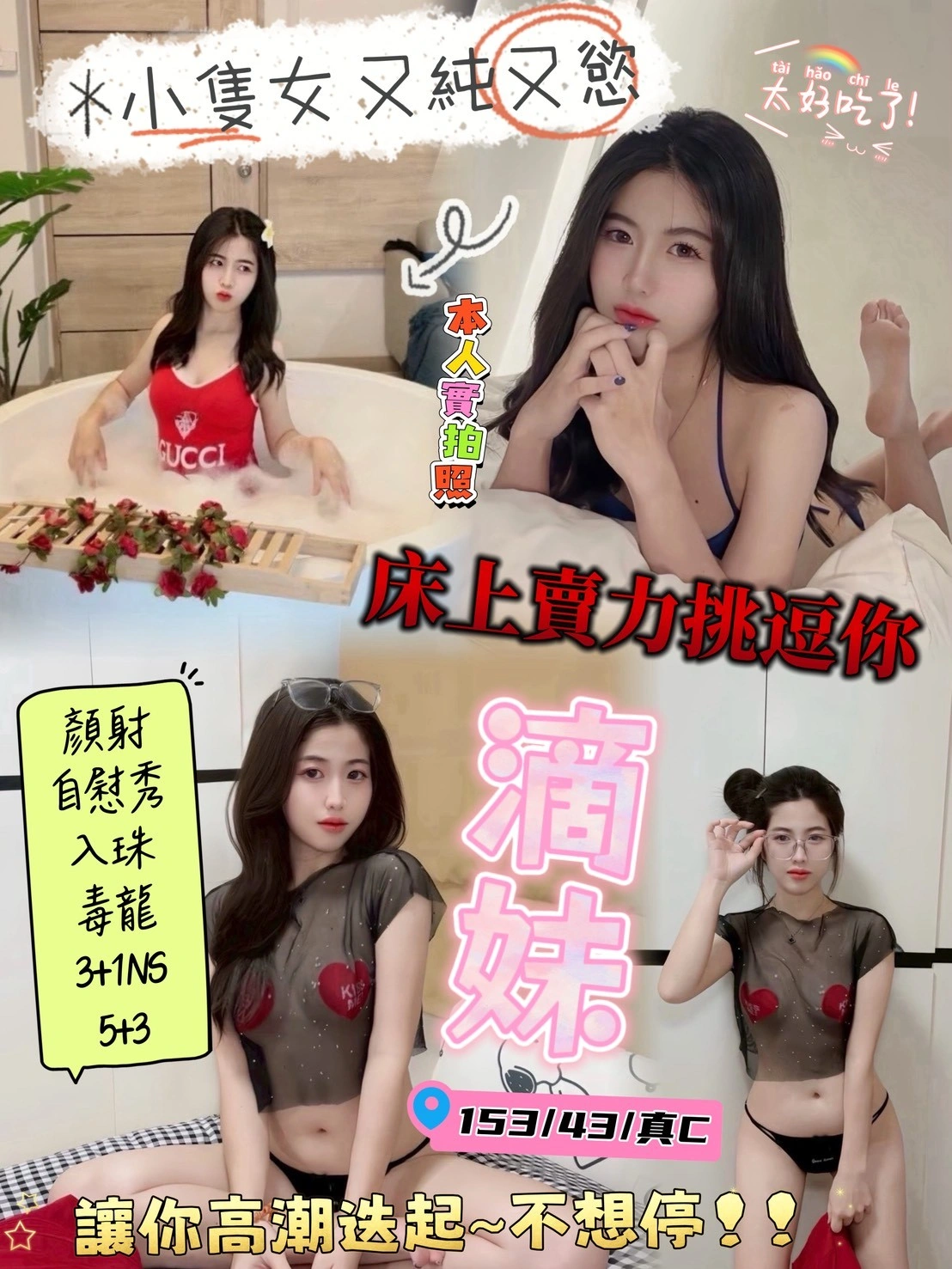 可配合 :按摩,69,共浴,LG(舌吻)依氣氛衛生而定,可親嘴,無套吹,品鮑,舔蛋,奶推,屁推,顏射,浴中蕭,絲襪,自慰秀,快餐,2S,NS