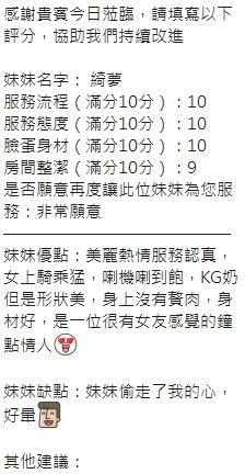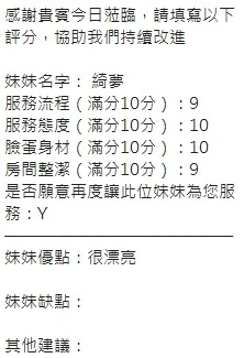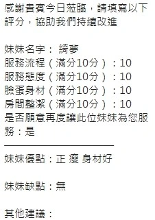 可配合 :奶砲,按摩,69,共浴,LG(舌吻)依氣氛衛生而定,可親嘴,無套吹,口爆,品鮑,舔蛋,奶推,屁推,顏射,水床浴,變裝(自備免付),絲襪(自備免付),快餐,2S,包夜