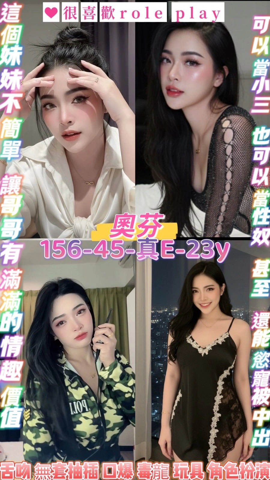 可配合 :奶砲,毒龍,按摩,69,共浴,LG(舌吻)依氣氛衛生而定,可親嘴,無套吹,口爆,品鮑,奶推,屁推,變裝(自備免付),絲襪,玩具(按摩棒),玩具(跳蛋),情趣用品(客自備),無套做,無套內射,自慰秀,快餐,2S,包夜