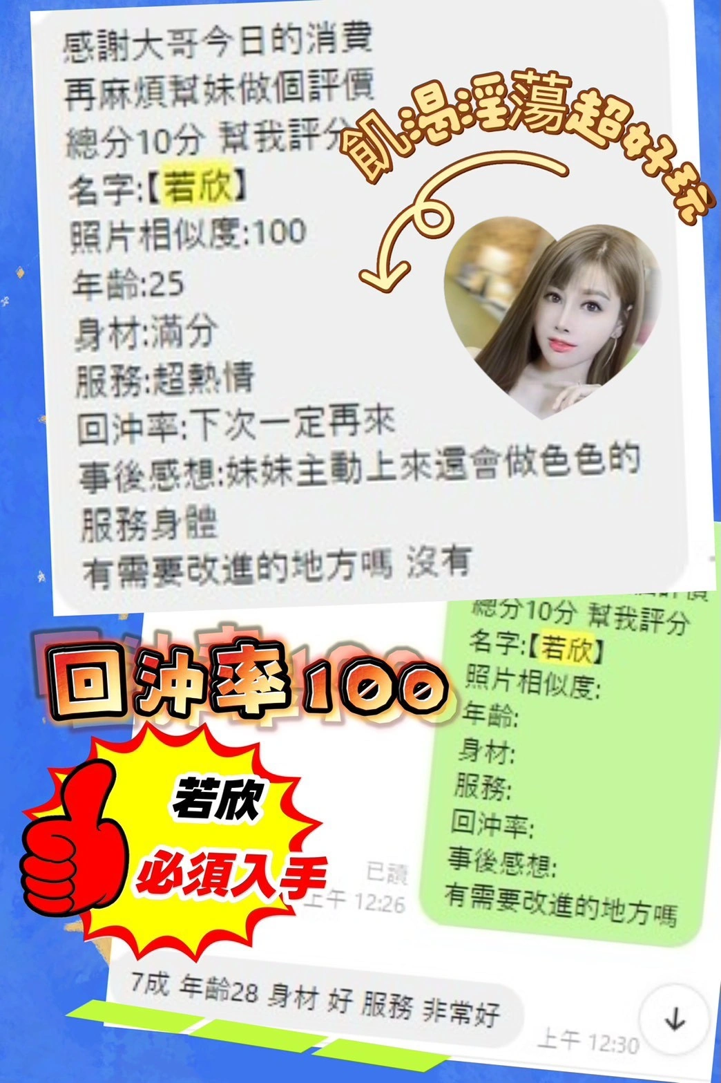 可配合 :奶砲,按摩,69,共浴,LG(舌吻)依氣氛衛生而定,可親嘴,無套吹,口爆,足交,品鮑,舔蛋,奶推,屁推,顏射,艷舞秀,絲襪,玩具(按摩棒),玩具(跳蛋),情趣用品(客自備),自慰秀,白人,中文溝通,快餐,2S,包夜