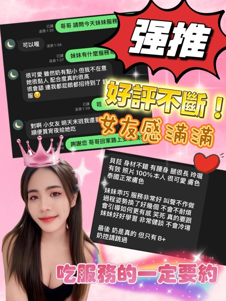 可配合 :奶砲,按摩,69,共浴,LG(舌吻)依氣氛衛生而定,可親嘴,無套吹,口爆,品鮑,舔蛋,奶推,冰火,顏射,浴中蕭,絲襪,玩具(按摩棒),玩具(跳蛋),快餐,2S,包夜