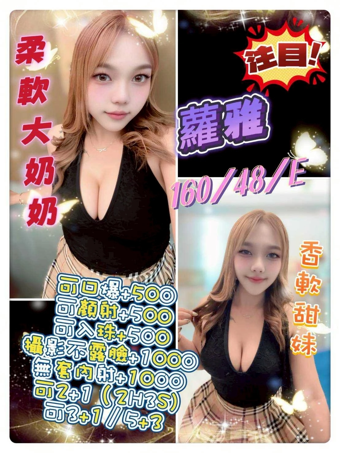 加價項目 : 2S+500(60分),顏射+500,入珠+500,攝影+1000(不露臉),口爆+500,無套內射+1000