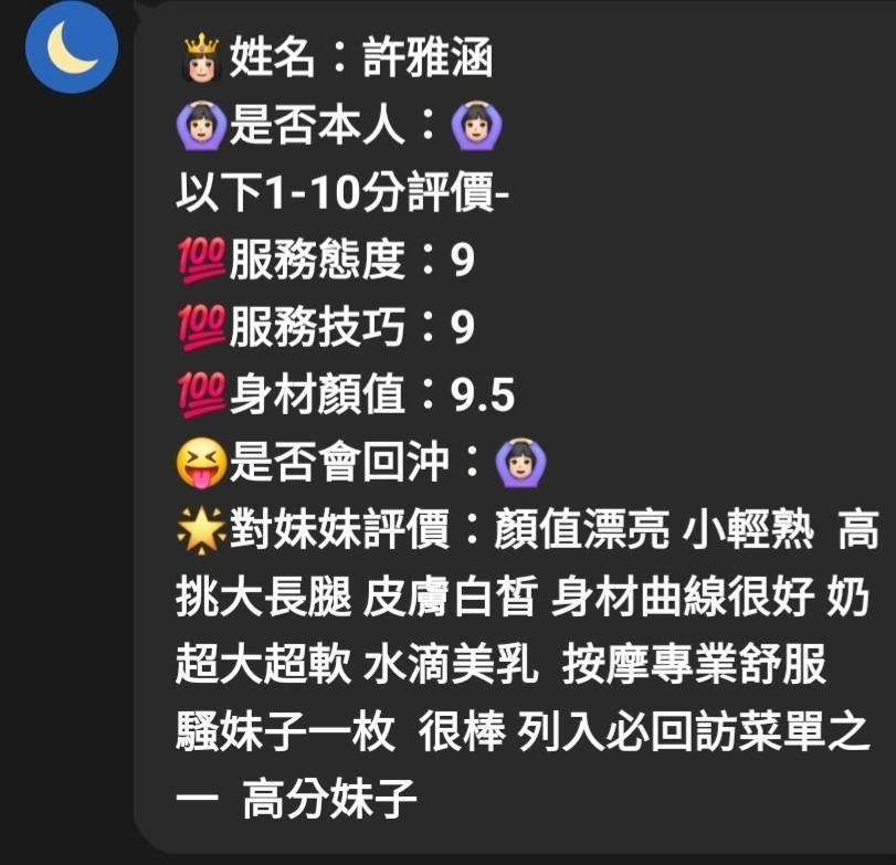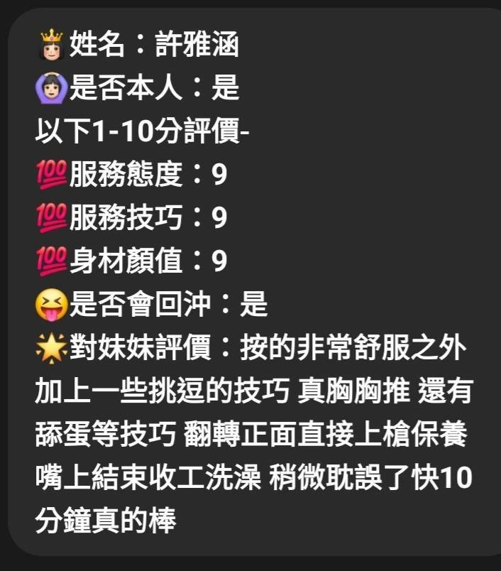 可配合 :按摩,69,共浴,LG(舌吻)依氣氛衛生而定,可親嘴,無套吹,口爆,品鮑,顏射,變裝(自備免付),絲襪(自備免付),玩具(按摩棒),玩具(跳蛋),情趣用品(客自備),自慰秀,快餐,2S