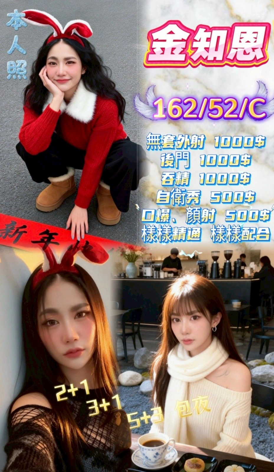 加價項目 : 2S+500(60分),口爆+500,顏射+500,吞精+1000,後門+1000,無套外射+1000
