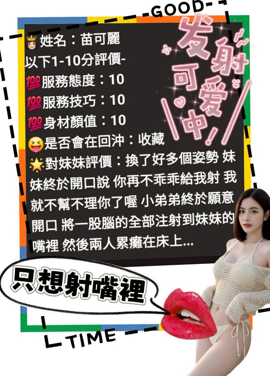可配合 :毒龍,按摩,69,共浴,LG(舌吻)依氣氛衛生而定,可親嘴,無套吹,口爆,品鮑,變裝(自備免付),絲襪(自備免付),玩具(按摩棒),玩具(跳蛋),情趣用品(客自備),快餐,2S