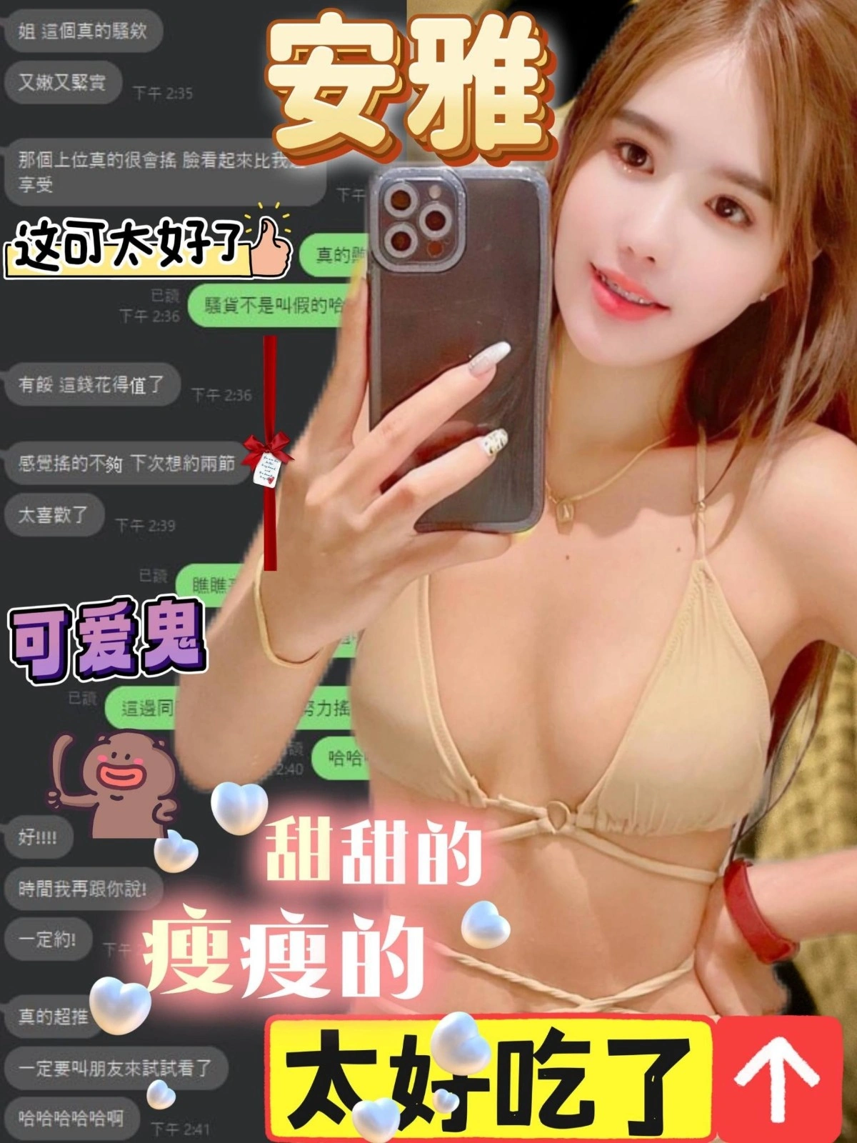 可配合 :奶砲,按摩,69,共浴,LG(舌吻)依氣氛衛生而定,可親嘴,無套吹,口爆,品鮑,舔蛋,顏射,絲襪(自備免付),玩具(按摩棒),玩具(跳蛋),情趣用品(客自備),快餐,2S