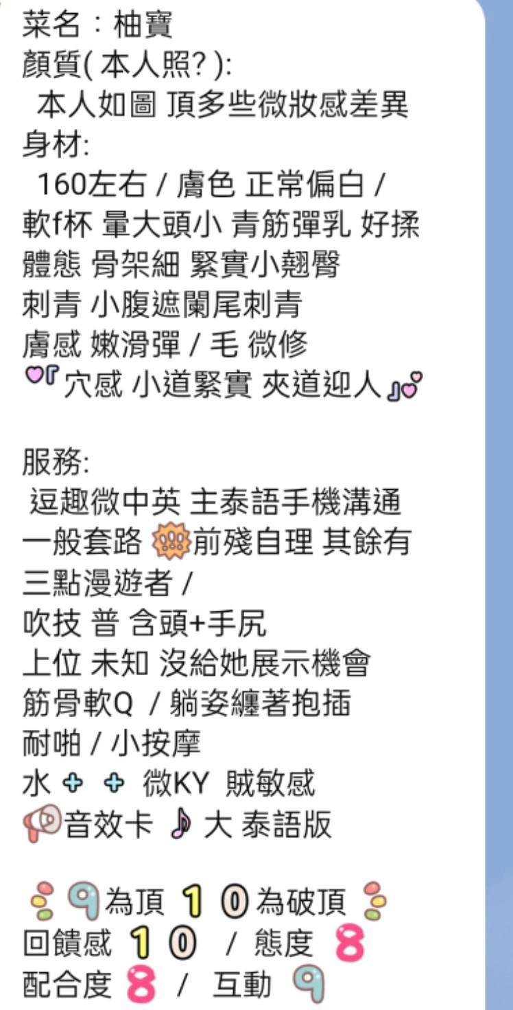 可配合 :按摩,69,殘廢澡,LG(舌吻)依氣氛衛生而定,可親嘴,無套吹,品鮑,奶推,屁推,快餐,2S
