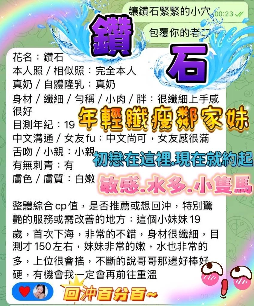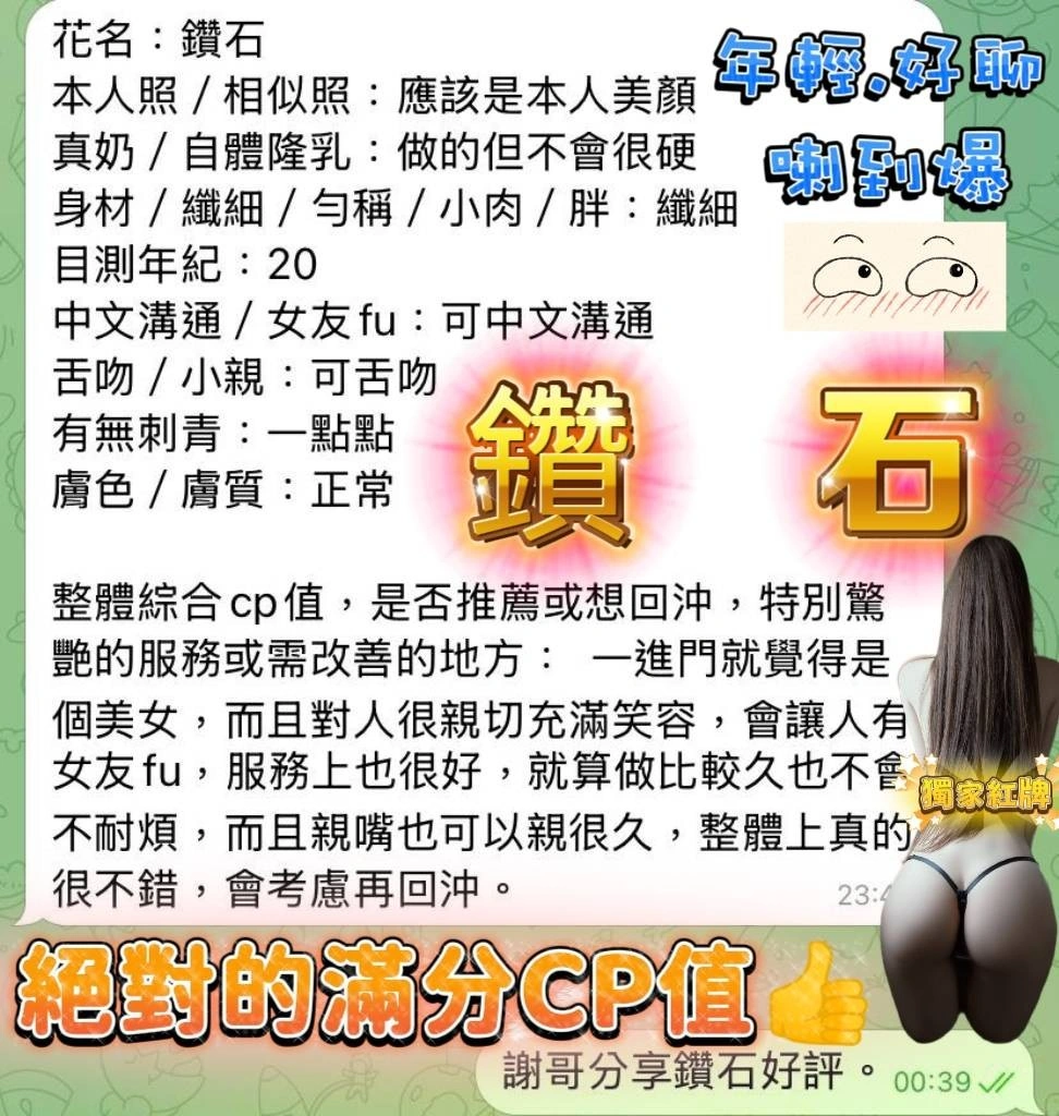 可配合 :奶砲,69,殘廢澡,LG(舌吻)依氣氛衛生而定,可親嘴,無套吹,口爆,舔蛋,漫遊,奶推,冰火,深喉嚨,絲襪(自備免付),白人,快餐,2S,包夜,射後清槍