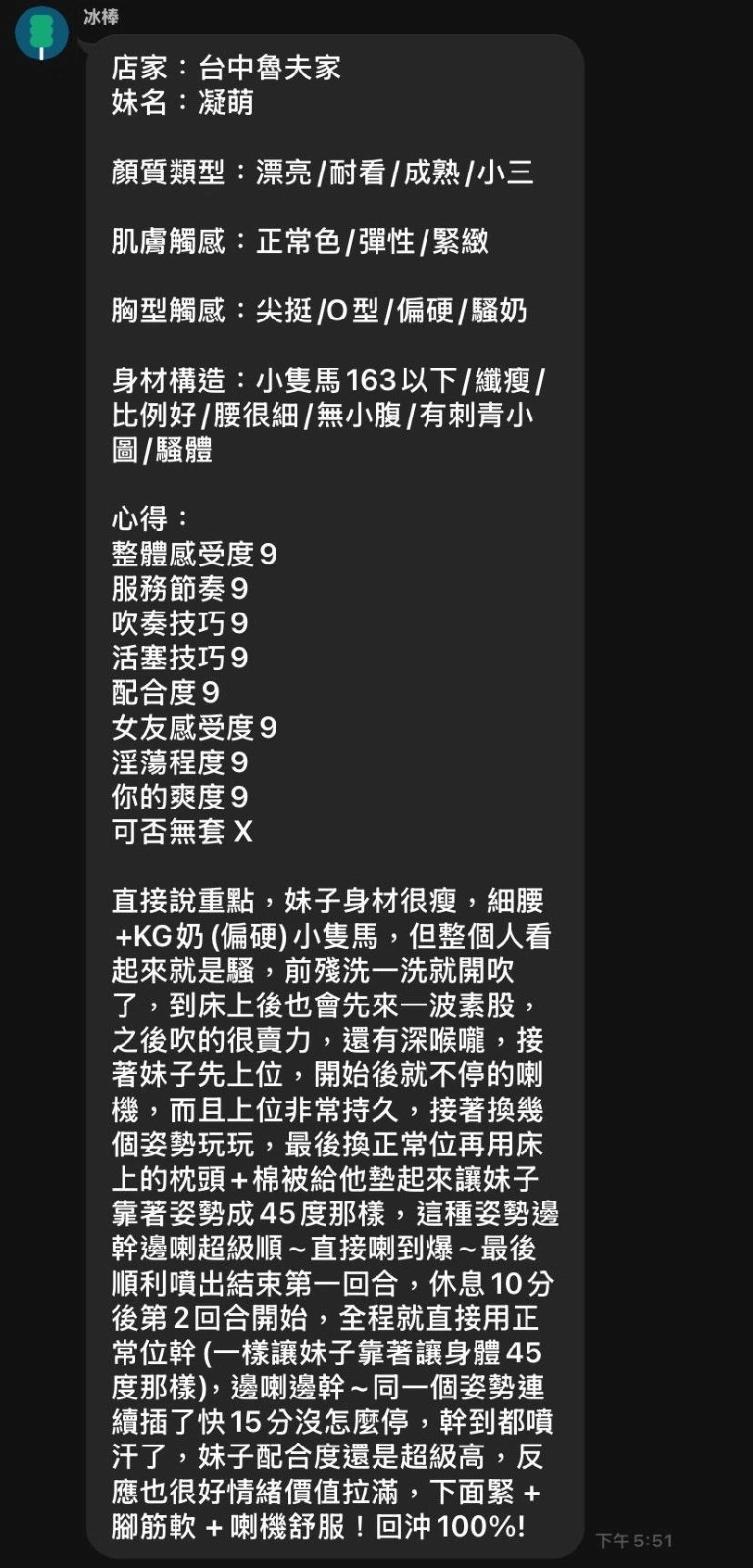 可配合 :奶砲,按摩,69,殘廢澡,LG(舌吻)依氣氛衛生而定,可親嘴,無套吹,口爆,品鮑,舔蛋,奶推,屁推,浴中蕭,深喉嚨,絲襪,玩具(按摩棒),玩具(跳蛋),快餐,2S,包夜