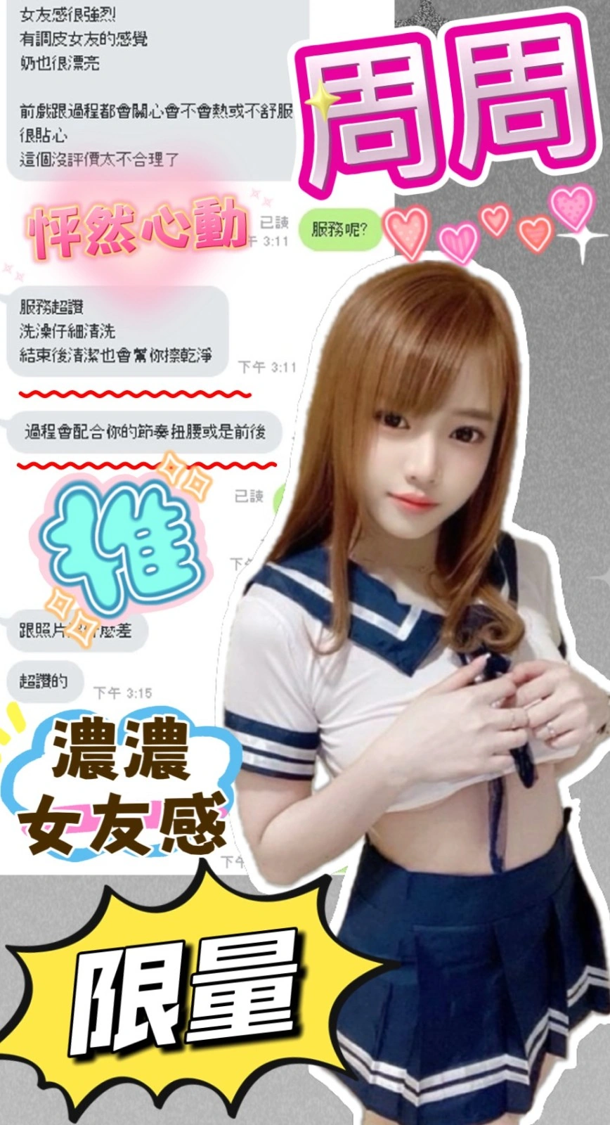 可配合 :奶砲,按摩,69,LG(舌吻)依氣氛衛生而定,可親嘴,無套吹,品鮑,舔蛋,奶推,屁推,顏射,絲襪(自備免付),玩具(按摩棒),玩具(跳蛋),情趣用品(客自備),英文溝通,快餐,2S