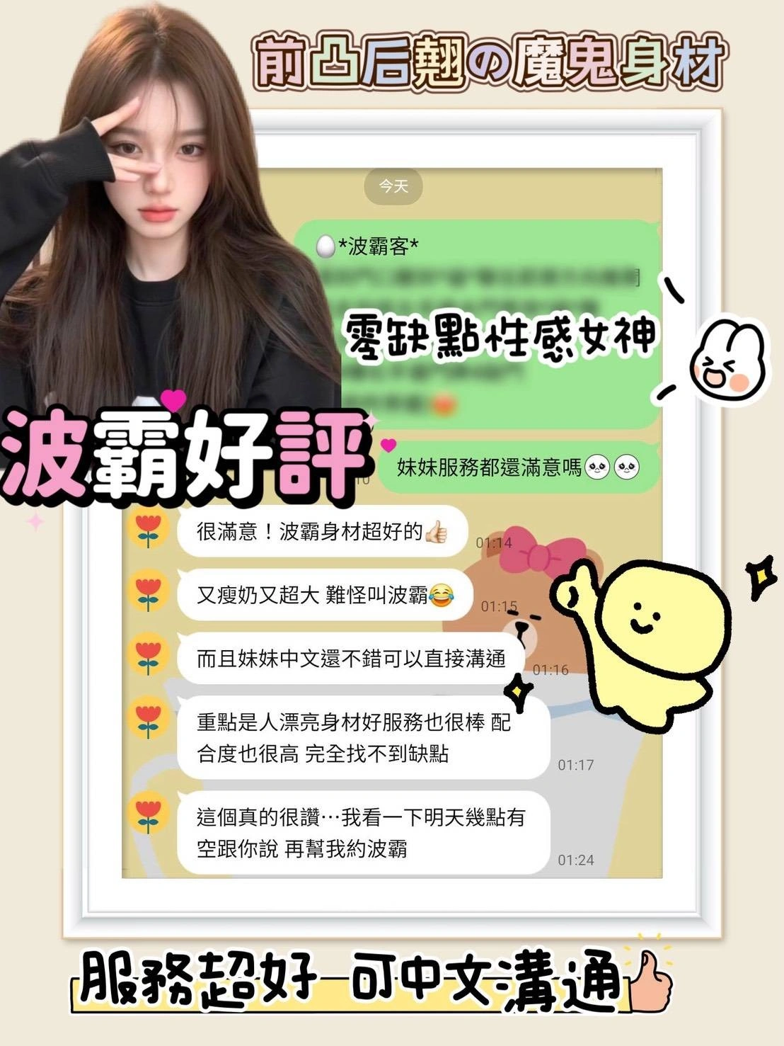 可配合 :毒龍,LG(舌吻)依氣氛衛生而定,可親嘴,無套吹,品鮑,舔蛋,艷舞秀,變裝(自備免付),絲襪(自備免付),玩具(按摩棒),玩具(跳蛋),快餐,2S