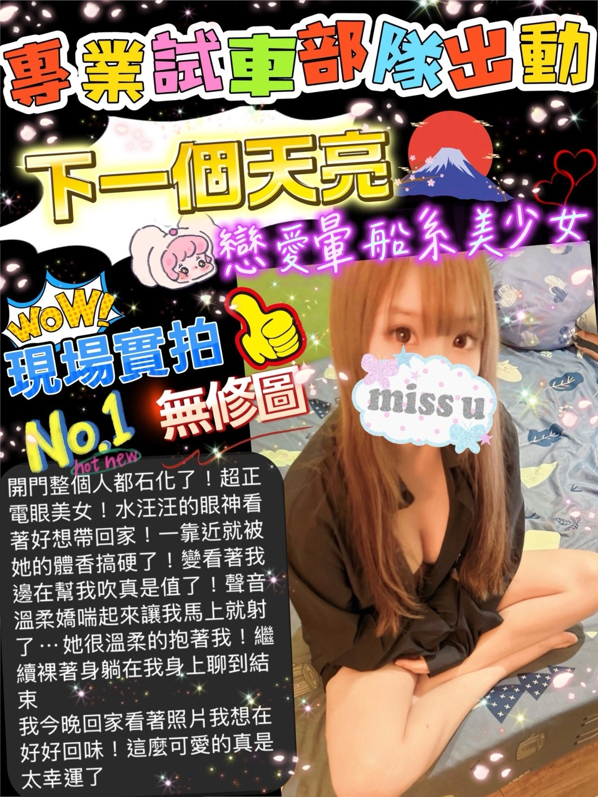 加價項目 : 跳跳糖+300,絲襪+300,顏射+1000,無套內射+7000,原味內褲+2000,原味內衣+3000