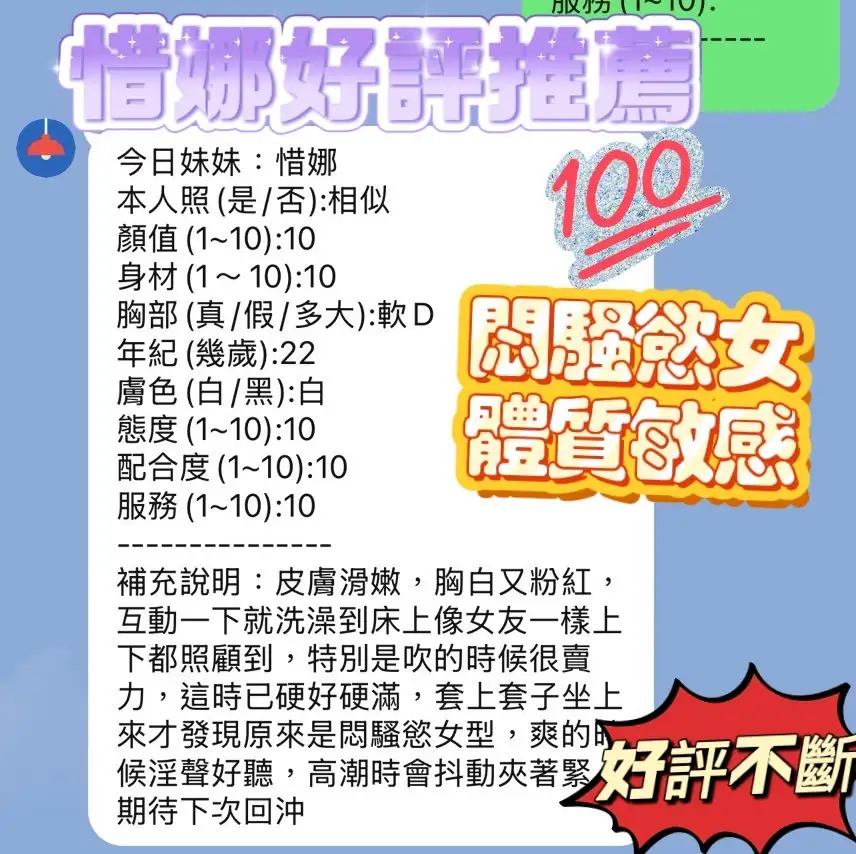 可配合 :奶砲,毒龍,按摩,69,共浴,帝王浴,LG(舌吻)依氣氛衛生而定,可親嘴,無套吹,口爆,吞精,品鮑,舔蛋,奶推,屁推,冰火,顏射,浴中蕭,深喉嚨,變裝(自備免付),絲襪(自備免付),快餐,2S,包夜