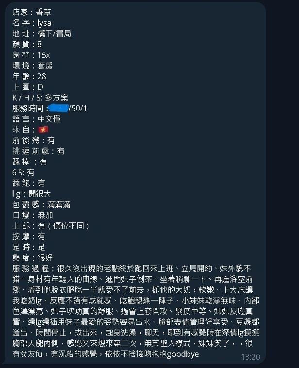 可配合 :奶砲,毒龍,按摩,69,共浴,LG(舌吻)依氣氛衛生而定,可親嘴,無套吹,口爆,吞精,品鮑,舔蛋,顏射,深喉嚨,玩具(按摩棒),玩具(跳蛋),情趣用品(客自備),後門,自慰秀,攝影,快餐,2S,包夜